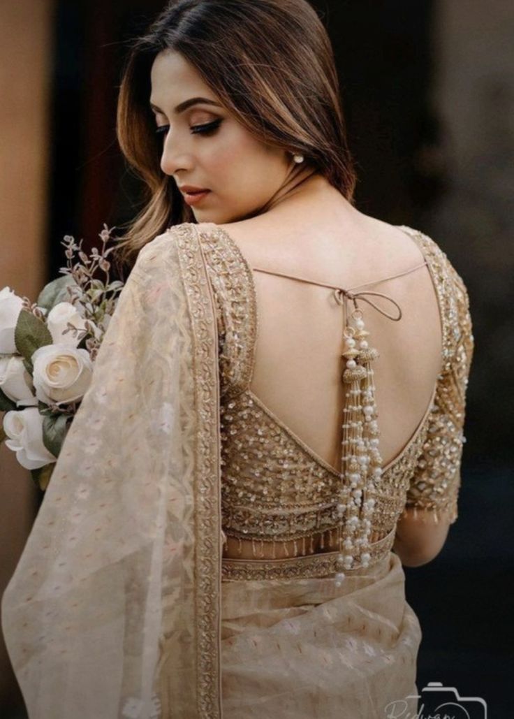 Bold and fashionable, backless blouses are for brides who love making a statement. Tie-up strings, tassels, or Dori designs at the back make it look stunning and elegant.