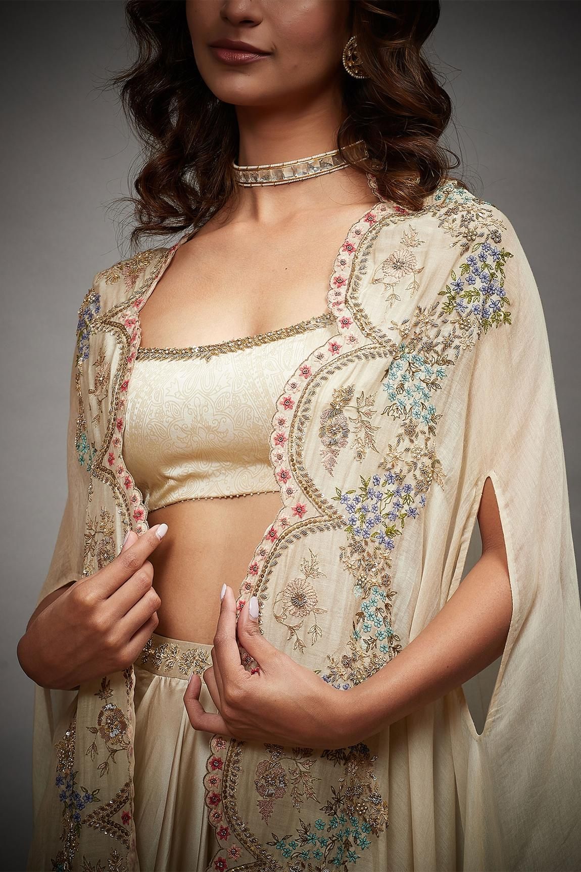 Cape blouses continue to trend in 2025. They add a dramatic and elegant flair to your bridal outfit. Ideal for receptions or sangeet events, this design combines comfort with style.