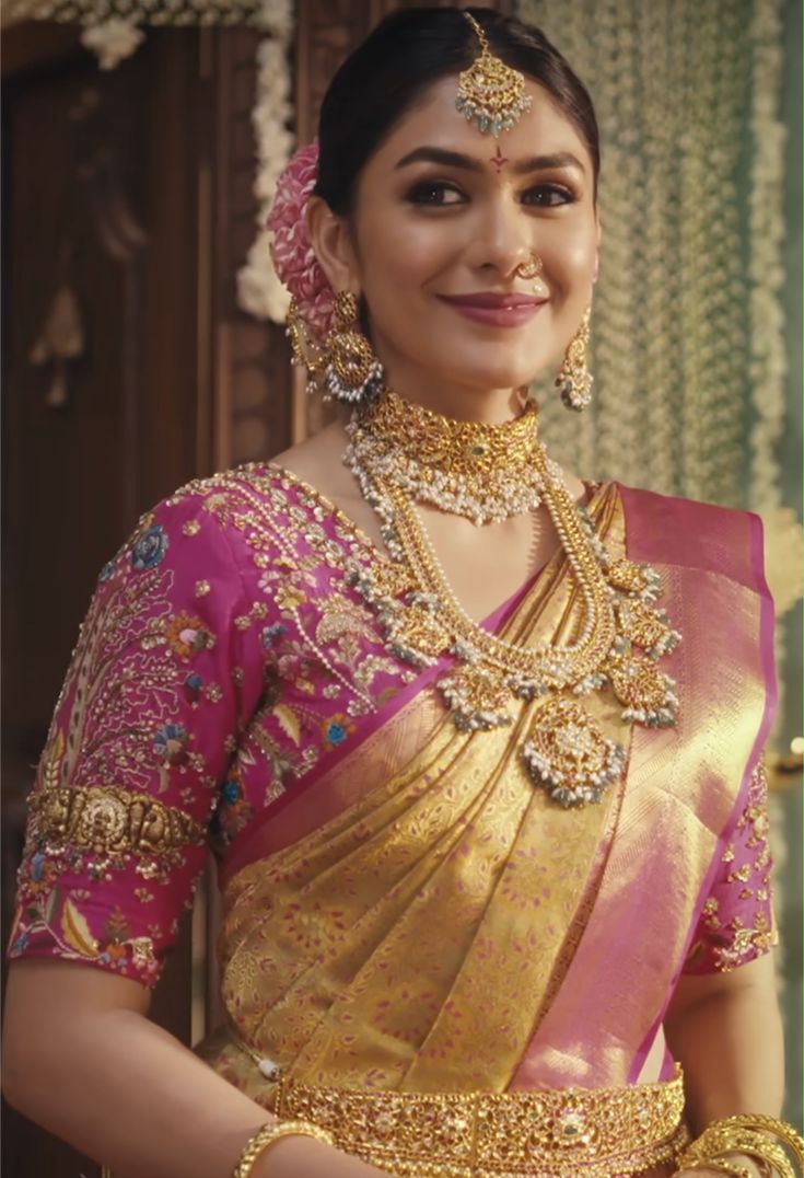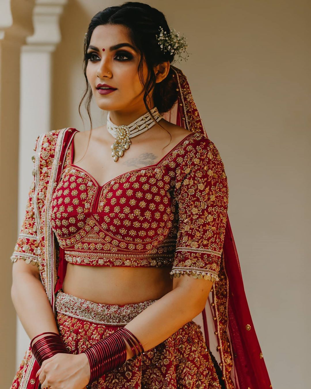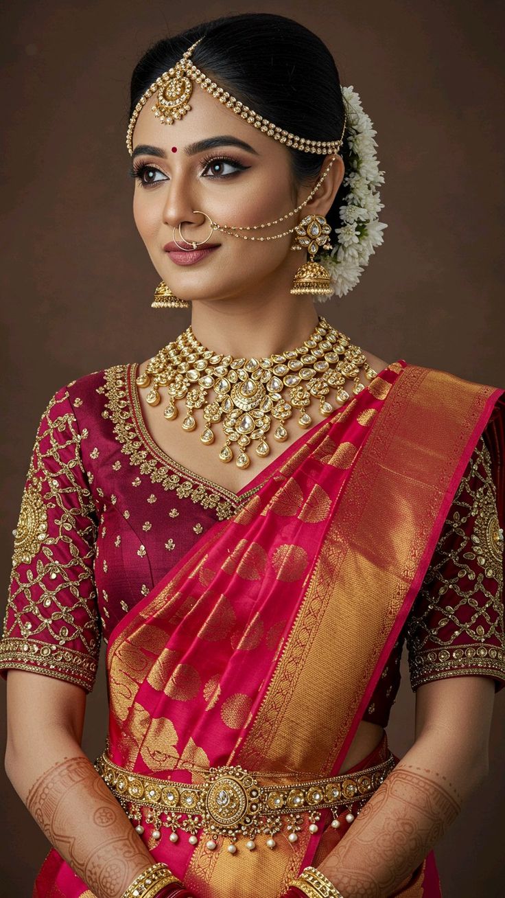 If you have broad shoulders, go for V-neck or deep neck designs. For petite brides, boat necks and puff sleeves look great. Always balance your blouse pattern with your saree drape.