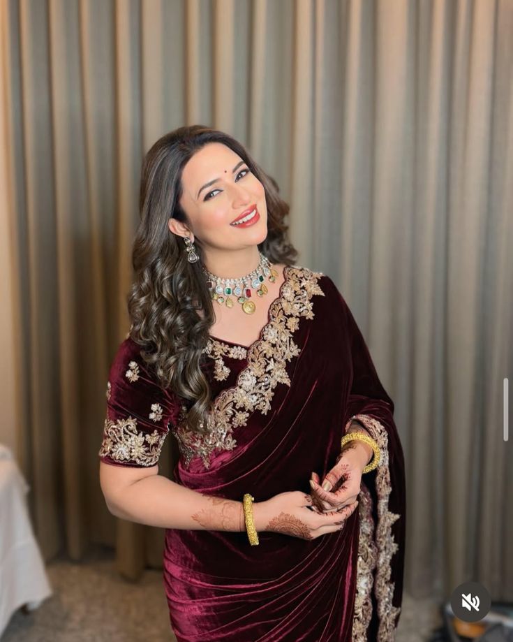 Rich and royal, velvet blouses are trending in 2025. The soft texture and deep tones make them perfect for winter weddings—shades like maroon, wine, emerald green, and royal blue look luxurious.